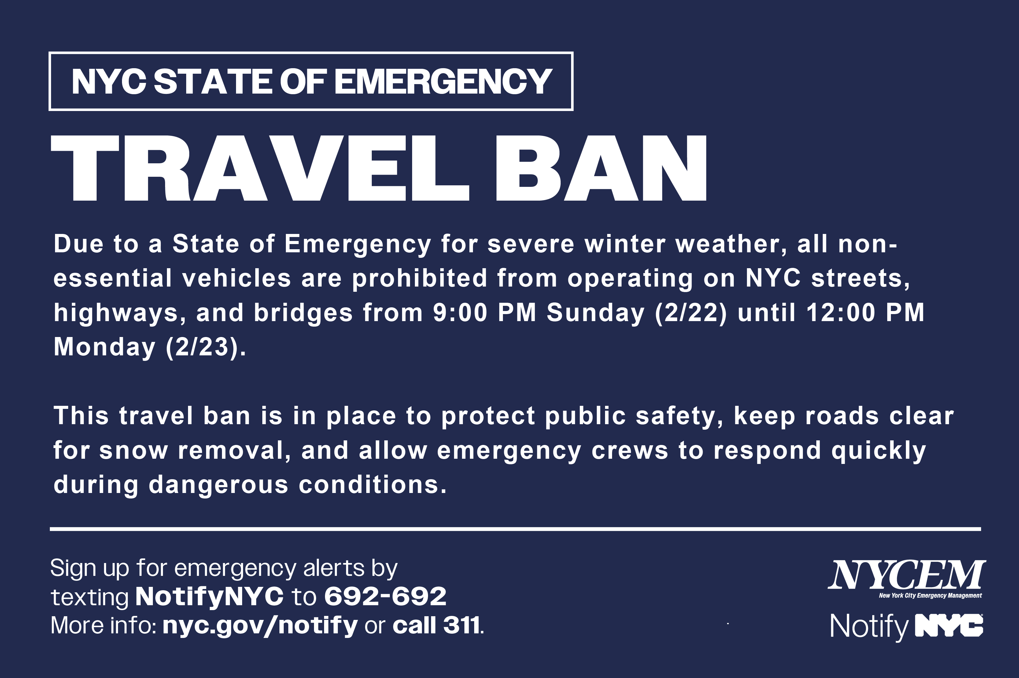 纽约市交通禁令:“从周日晚间9点,到周一中午12点,纽约全市所有街道,公路,桥梁,禁止所有非紧急车辆通行”。